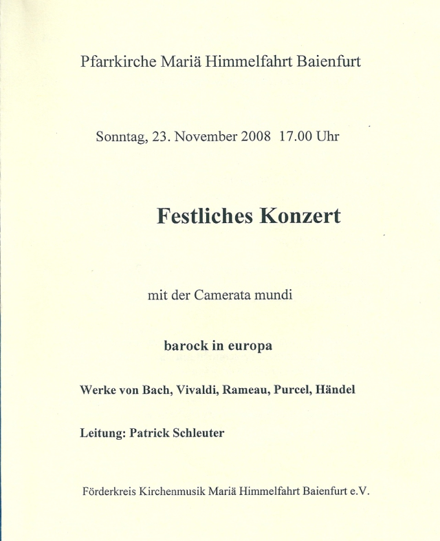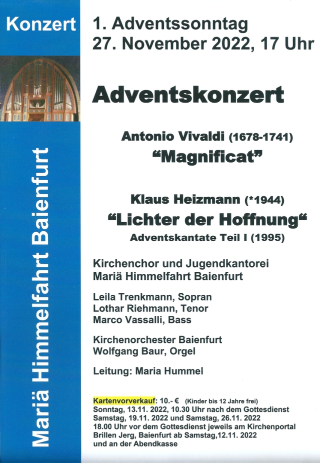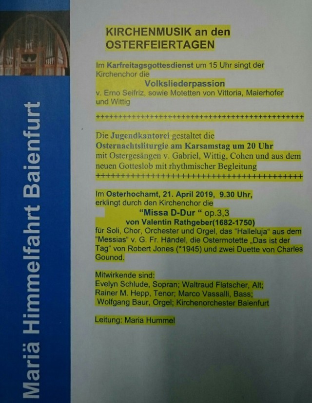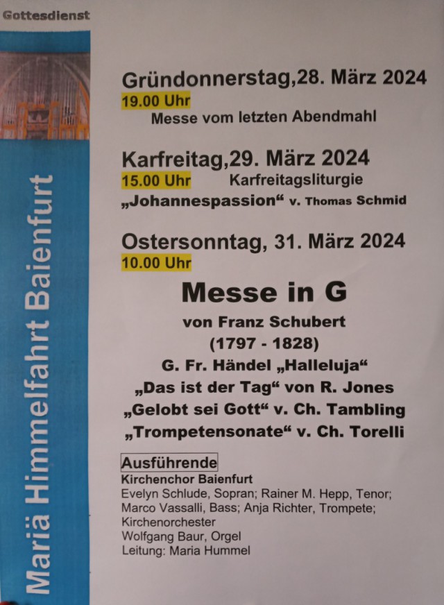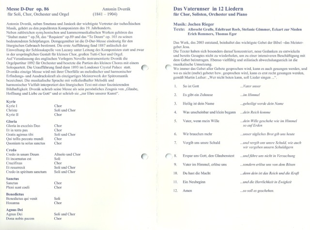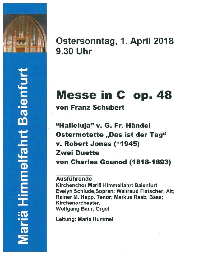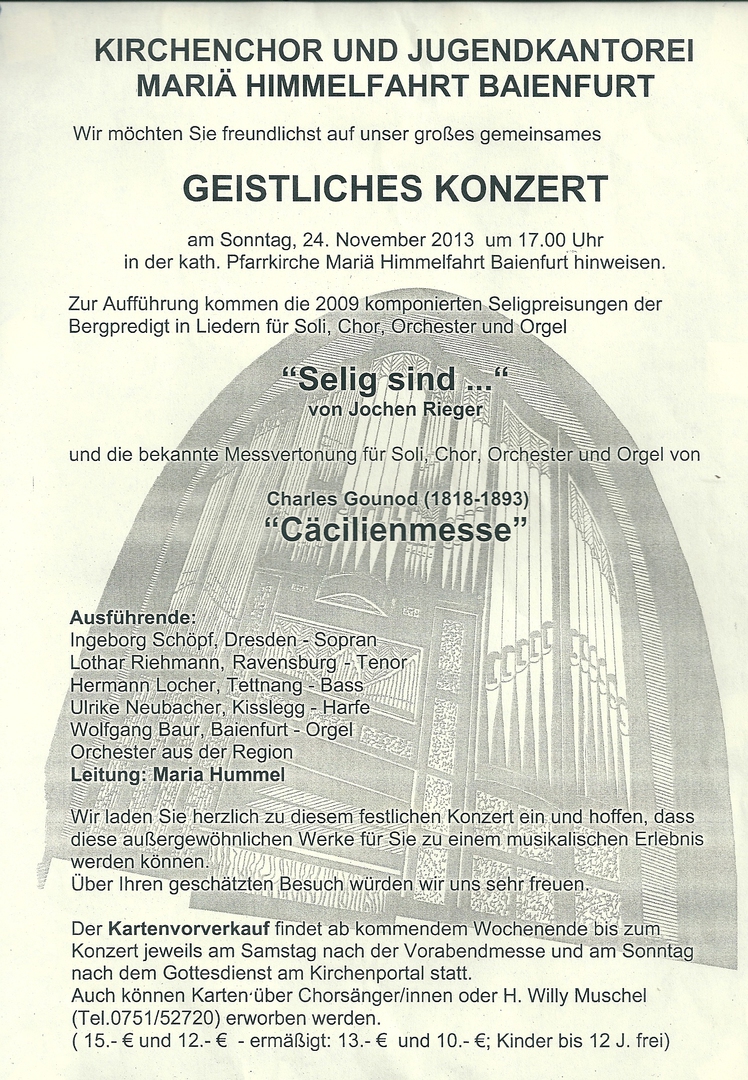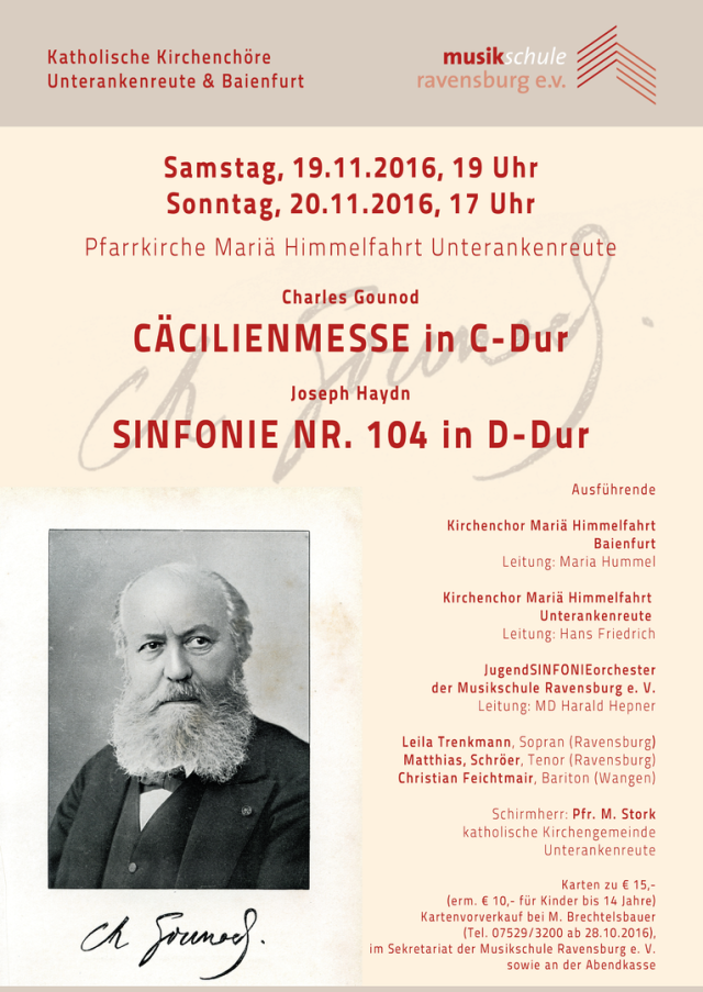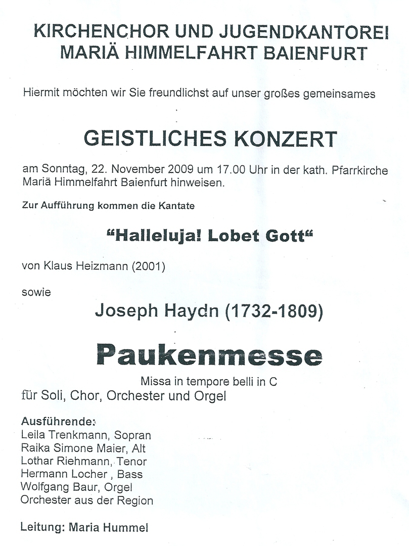 Neben unserer Hauptaufgabe, der feierlichen Mitgestaltung der Liturgie in der Kirche mit deutschen und lateinischen Messen, Chorsätzen, Kantaten und Orchestermessen, veranstalten wir alle 2 Jahre ein Kirchenkonzert mit größeren Chorwerken aus verschiedenen Epochen.