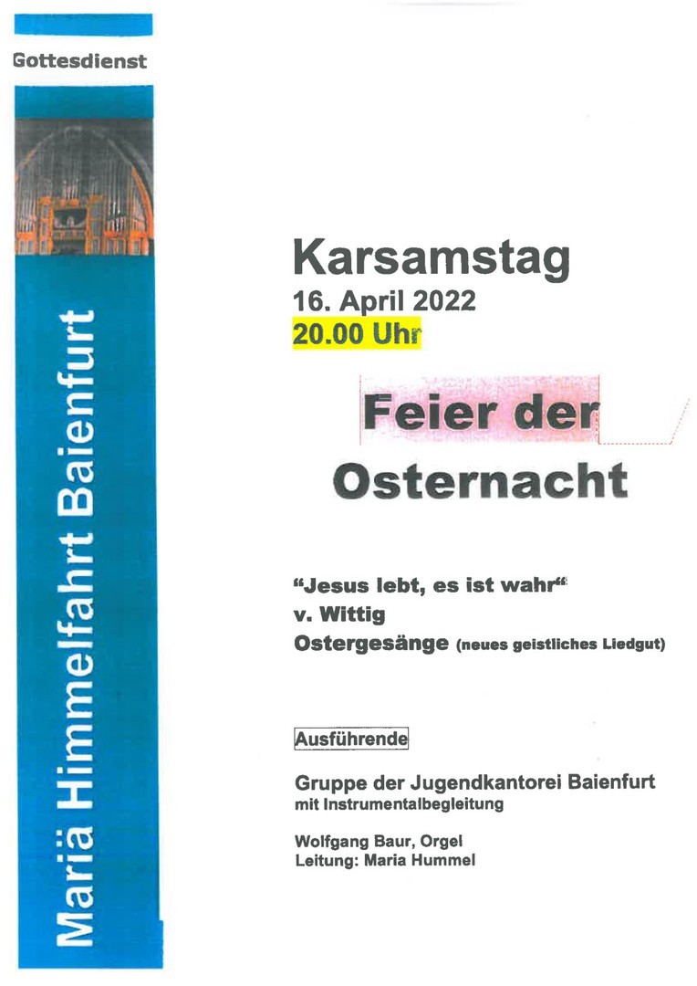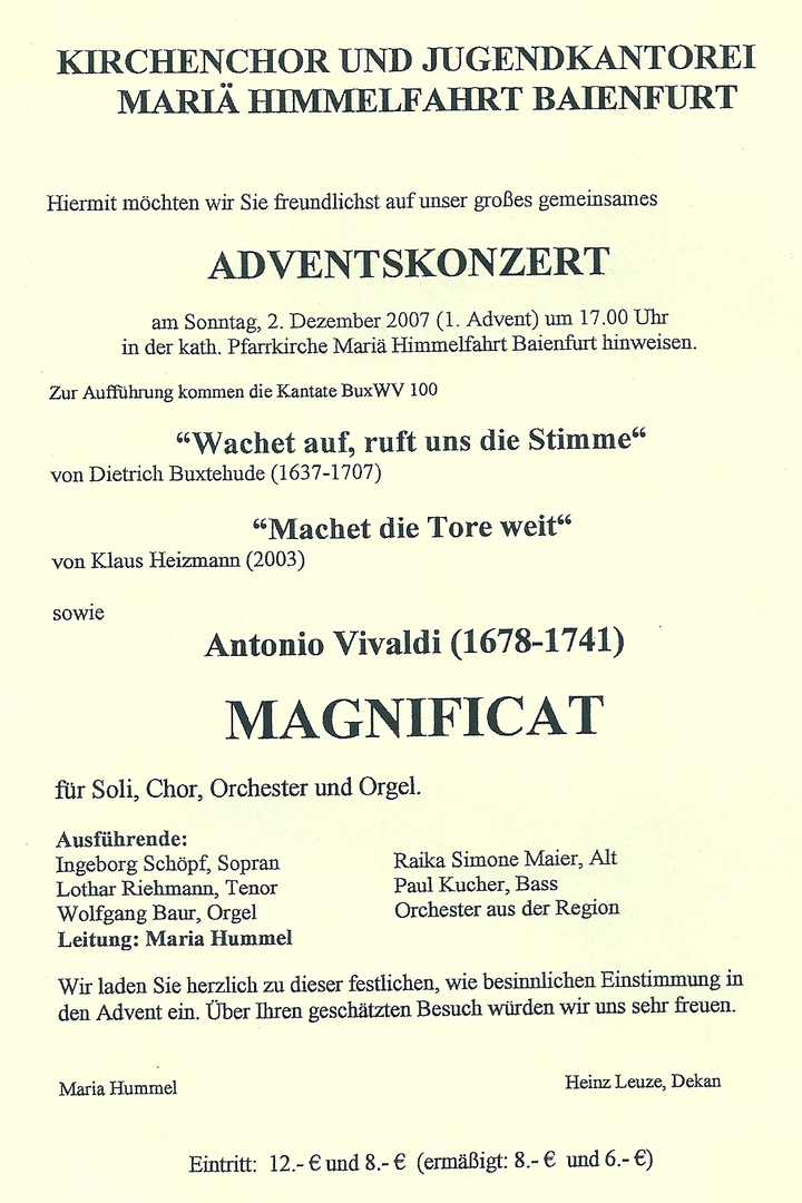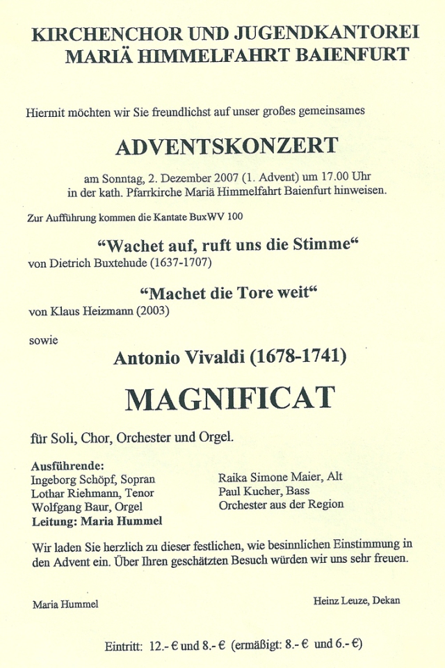 Feierliche Klänge eines kleinen, feinen Ensembles begleiteten den kraftvollen lobpreisenden Gesang zum „Magnifikat RV 610“ von Antonio Vivaldi. Anna – Theresa Sigmund – Mikolasek, Andreas Pflug, Carmen Jerg, Sophia Kibler, Hans Vogler, Dr. Mechthild Schmidt, Annette Friedrich, Lisa Brugger, Sarah lemke, Helene Maier und Wolfgang Baur untermalten und verstärkten mit ihren Instrumenten die musikalischen Aussagen der Sängerinnen und Sänger auf beeindruckende Weise.