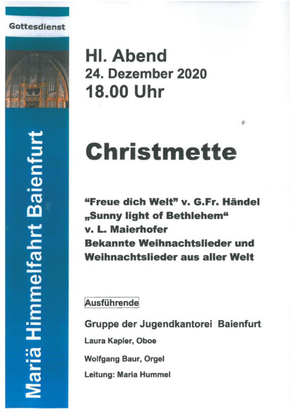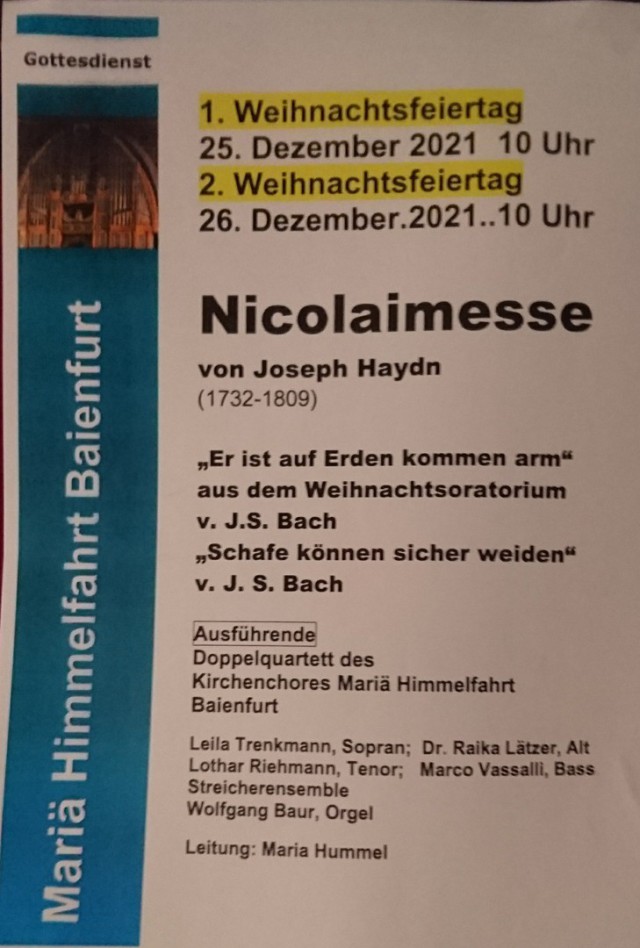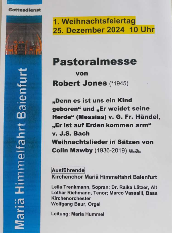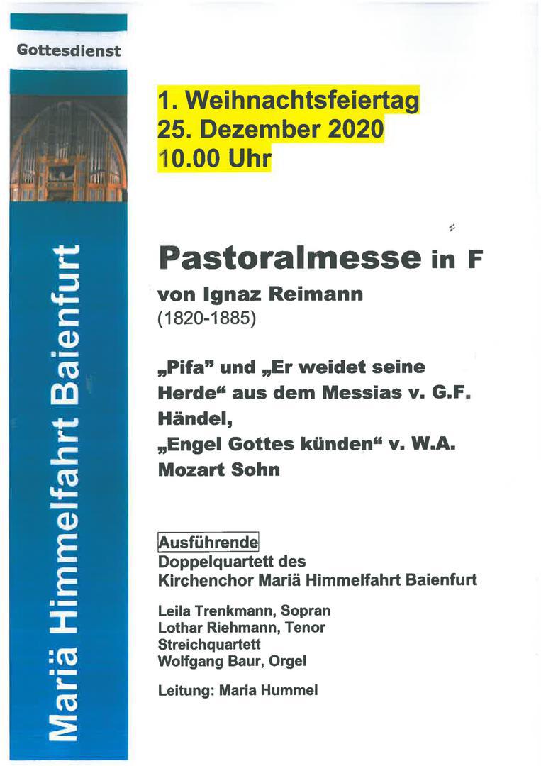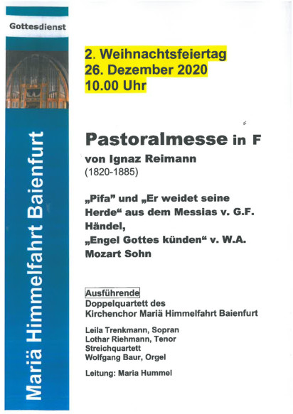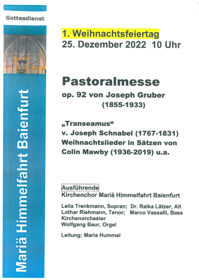 Weihnachtshochamt am 25. Dezember um 9.30 Uhr mit der Hirtenmesse von Ferdinand Schubert (1794 - 1859) für Soli, Chor, Orchester und Orgel und Teile aus dem „Weihnachtsoratorium“ von J.S. Bach.