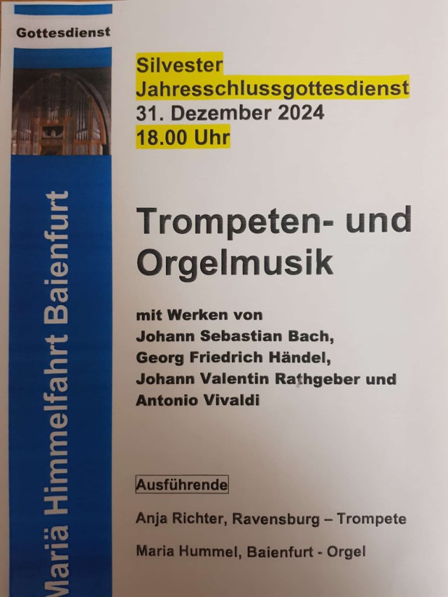 Der Jahresabschlussgottesdienst am Silvestertag, 31.12.2019 um 17.30 Uhr wurde durch festliche Trompeten- und Orgelmusik englischer und italienischer Meister mitgestaltet.