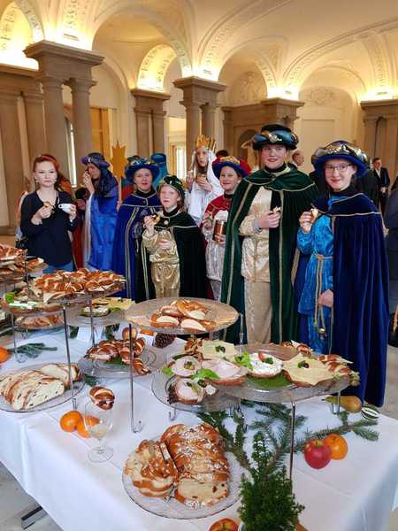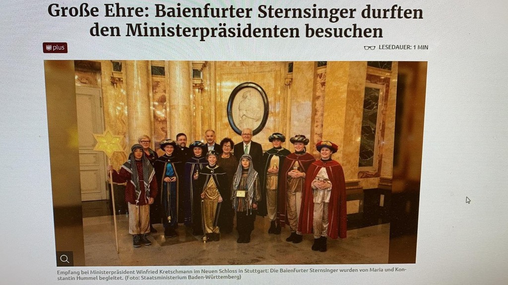 Ein ganz großes Ereignis war für uns Baienfurter Sternsinger - insbesondere auch für unsere achtköpfige Abordnung mit Marlene Baumert, Marie Göppel, Lukas Haupter, Xenia Hund, Laura Kapler, Katrin Schorrer, Elena Stärk und Noah Stucke unter Begleitung von Maria und Konstantin Hummel sowie Martina Stucke - die Einladung zum Empfang der Landesregierung durch Ministerpräsident Winfried Kretschmann. Mit dabei war auch Franziska Stölzle von der Schwäbischen Zeitung. Mit neun weiteren Sternsingerabordnungen aus Baden-Württemberg waren wir ins Neue Schloss nach Stuttgart eingeladen. Vor dem Portal zu diesem ehrwürdigen Gebäude, empfing der Ministerpräsident mit seiner Gattin Gerlinde den Zug der 80 Sternsinger mit ihren Begleitern. Im Marmorsaal begrüßte Winfried Kretschmann dann die Gruppen. Er dankte ihnen stellvertretend für alle Sternsinger des Landes für ihren vorbildlichen Einsatz - ebenso den für die Aktion Verantwortlichen in den Pfarrgemeinden und Seelsorgeeinheiten. Er hob in seiner sehr wertschätzenden Rede hervor, dass mit dieser ganz bedeutenden und größten Aktion von Kindern und Jugendlichen für Kinder enorm Wertvolles geleistet wird. Er betonte, wenn alle wie sie, etwas Kleines tun, dann wird daraus etwas ganz Großes. So waren bei der Sternsingeraktion 2019 allein in Baden-Württemberg fünfzigtausend Mädchen und Jungen als Sternsinger im Einsatz und sie sammelten insgesamt 10 Millionen Euro. Jede Sternsingergruppe hatte eine bestimmte Aufgabe. Unsere Sternsinger mussten sich mit dem Thema „Frieden“ befassen. Sie trugen - durch selbst gestaltete Plakate visuell unterstützt - ihre Gedanken vor wie „Was sie sich zukünftig für den Frieden wünschen und wie sie zum Frieden beitragen können - denn Frieden fängt im Kleinen an - man darf nicht nur vom Frieden reden, sondern jeder muss etwas dafür tun“. Nach dem daran anschließenden Fotoshooting mit dem Ministerpräsidenten und Frau Kretschmann, war das abschließende gemeinsame Essen. Erfüllt und begeistert von dieser schönen, beeindruckenden Begegnung und der Freundlichkeit der Organisatoren, traten wir dann die Heimreise an. Der Dienstag, 7. Januar 2020 wird als ganz besonderer Tag unvergessen bleiben.